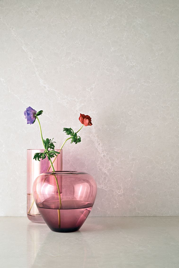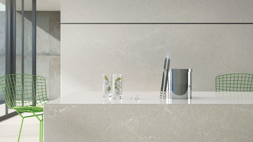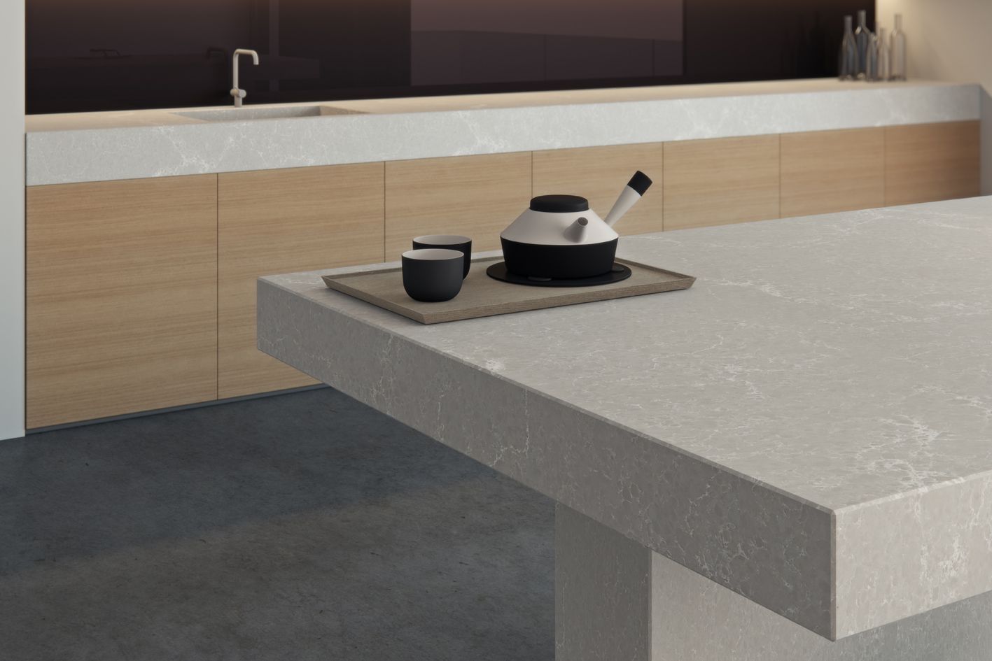 אבן קיסר דגם 5110 Alpine Mist, משטח שיש בצבע אפור קריר עם עורקים לבנים עדינים שיוצרים ניגודיות עם שבבים אפורים כהים יותר אשר יוצרים הילה ממגנטת ועיצוב של משטח יוקרתי.
